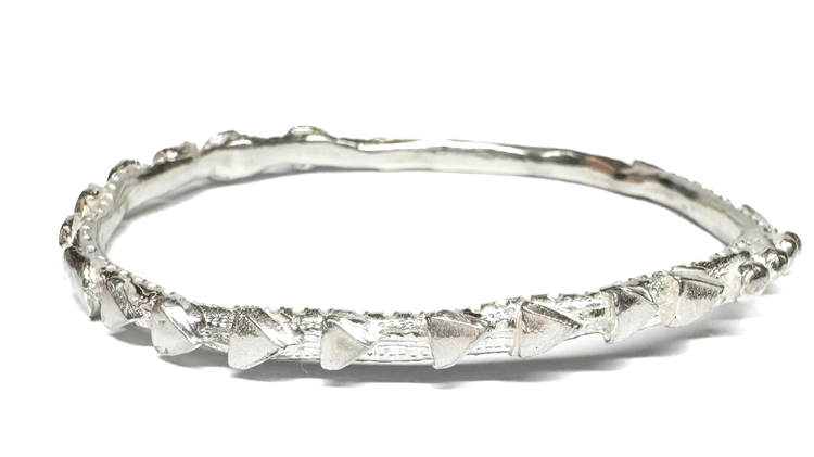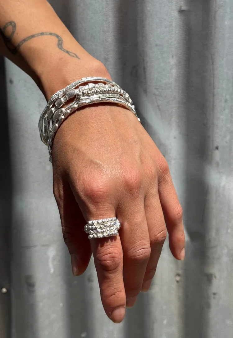 These bangles were created to honour this long, almost magical history of wear and meaning. Each rotation reveals something new to discover, and their surfaces invite touch through rich texture. Two types are presented here: one features a twisted form, adding a sense of movement as it wraps around the arm; the other begins with an exaggerated oval bar—similar to a ring top—expanded in scale to become a bangle.